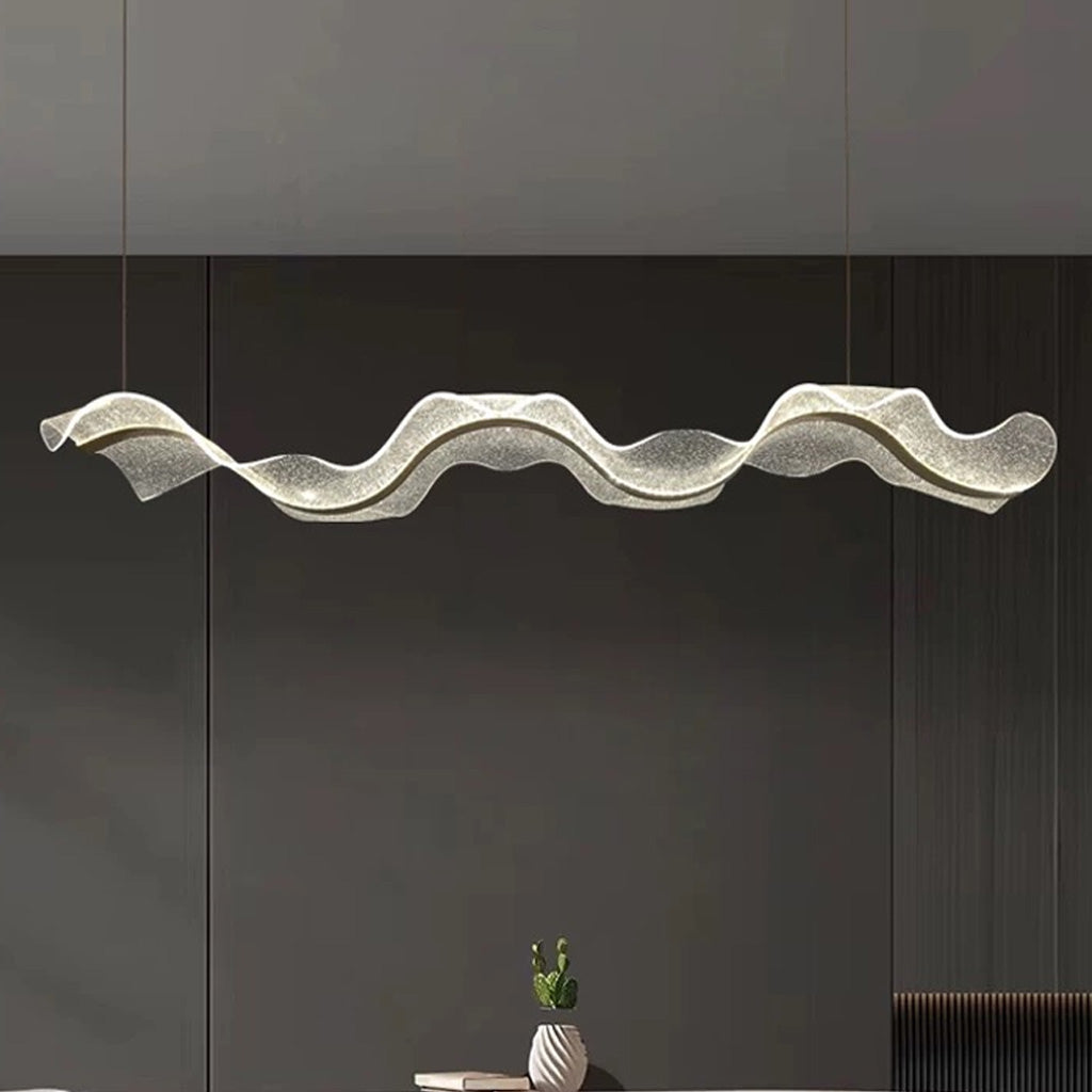 Wave Pendant Light | Modern Statement Ceiling Lighting features a minimalist, wave-shaped acrylic shade with integrated LED for bright, atmospheric illumination. With adjustable warm/neutral/white light, it enhances dining and living spaces with a refined focal glow.